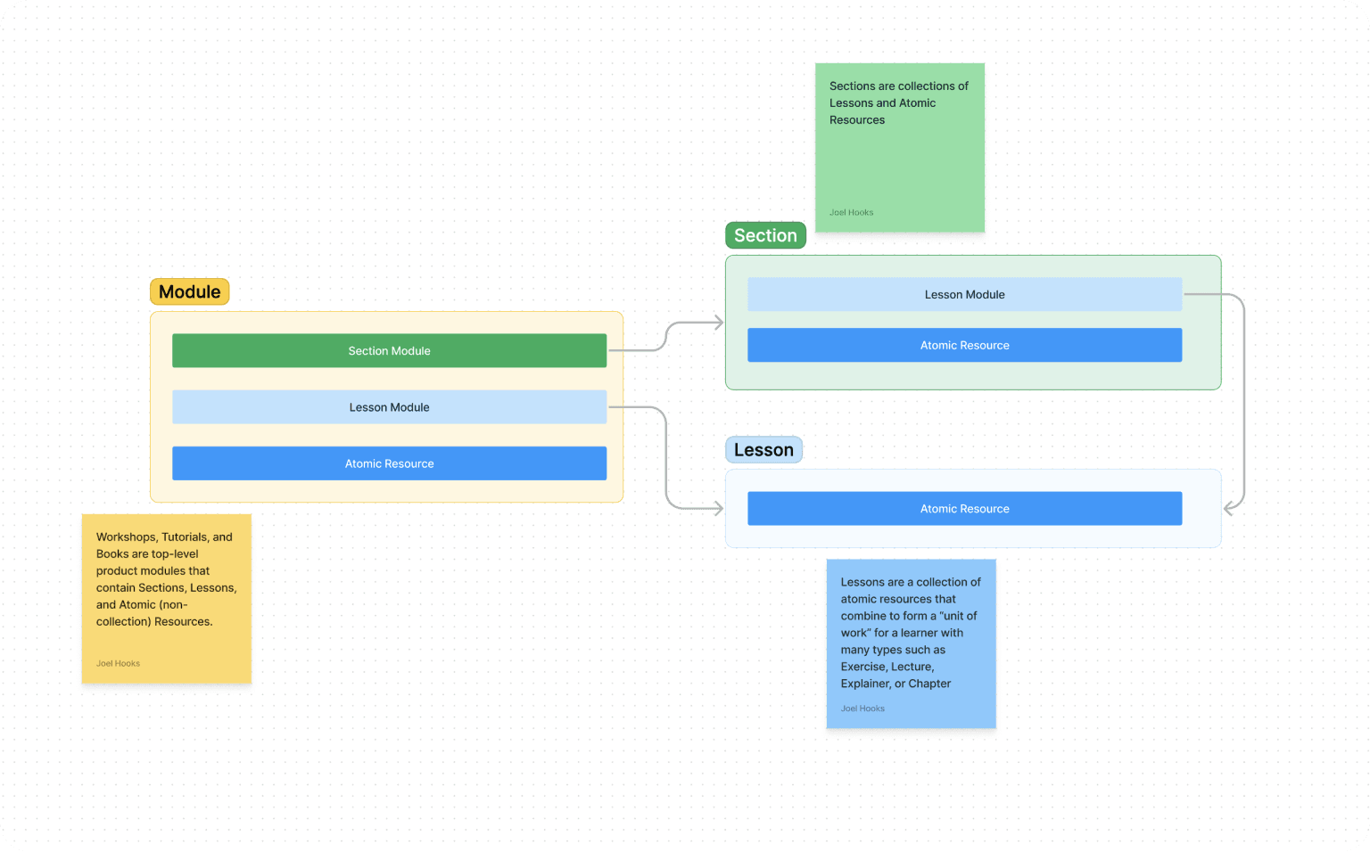 At the lowest level we have the Lesson which is a collection of resources that delivers a unit of learning. This is similar to building a page in Notion or other type of block editor. Stack, structure, move stuff around, edit, and present something that is coherent and meets the learning goals of the lesson.